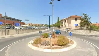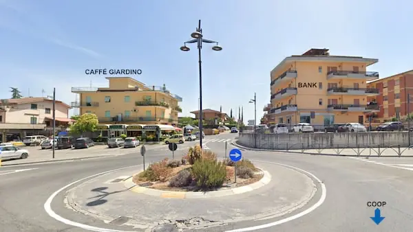 Sie fahren vom Haus auf die 'Strada degli Inglesi' und dann den Berg ganz hinunter; unten biegen Sie nach rechts auf die 'Via Farense'. Kurz vor Passo Corese biegen Sie (nach exakt 3,3 Km) beim Schild "Cimiterio" (Friedhof) rechts ab und halten sich dann geradeaus. So kommen Sie zu einem Kreisverkehr, an dem Sie auch den Coop-Supermarkt vorfinden, ebenso wie das "Caffé Giardino" und weitere Einkaufsmöglichkeiten. Wenn Sie den Kreisverkehr geradeaus überqueren, ist auch der Weg zur "Stazione" (Bahnhof) ausgeschildert.