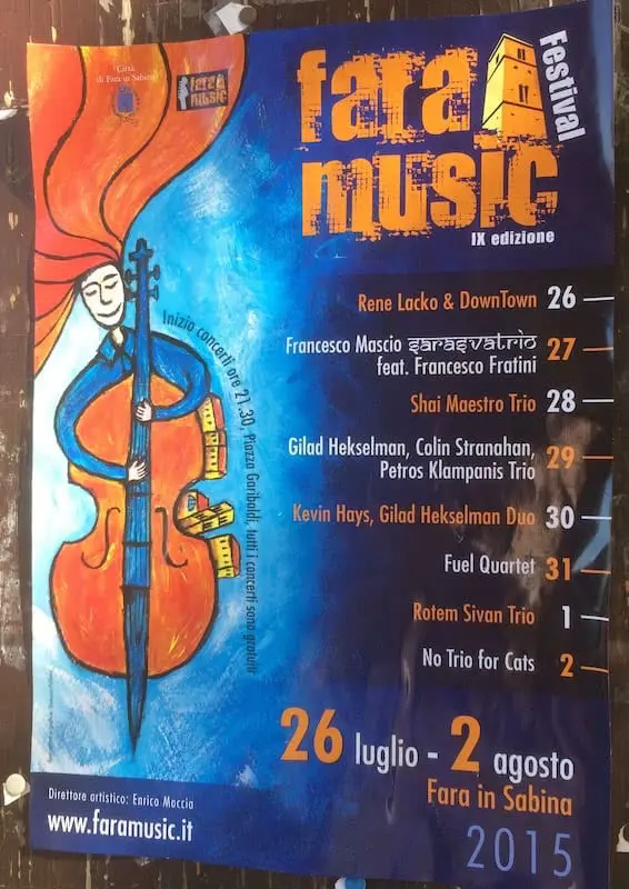 Jedes Jahr im Juli findet in der Altstadt von Fara Sabina das Sommer Jazz Festival statt, ein Highlight für Jazz-Fans aus aller Welt. Das Festival gehört zur Summer Festival School, die in jedem Sommer viele Jazzmusiker von weither in die Sabiner Berge zieht. Zum Abschluss finden eine Woche lang in der wunderbar illuminierten Altstadt Konzerte, Flohmärkte, Basare, Events statt. Über die Festivalwoche informiert die Seite www.faramusic.it!