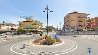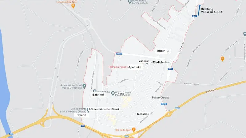 Sie fahren vom Haus auf die 'Strada degli Inglesi' und dann den Berg ganz hinunter; unten biegen Sie nach rechts auf die 'Via Farense'. Kurz vor Passo Corese biegen Sie (nach exakt 3,3 Km) beim Schild "Cimiterio" (Friedhof) rechts ab und halten sich dann geradeaus. So kommen Sie zu einem Kreisverkehr, an dem Sie auch den Coop-Supermarkt vorfinden, ebenso wie das "Caffé Giardino" und weitere Einkaufsmöglichkeiten. Wenn Sie den Kreisverkehr geradeaus überqueren, ist auch der Weg zur "Stazione" (Bahnhof) ausgeschildert.